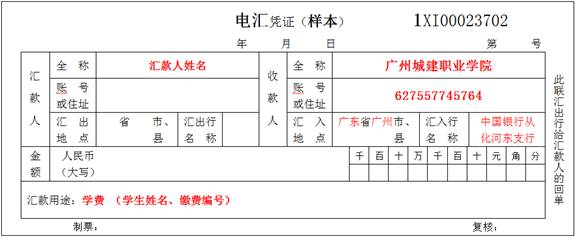 汇入行名称: 中国银行从化河东支行;金额栏填写缴费金额和大写金额;