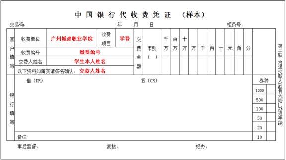 代收费凭证适用于在广东省内(深圳除外)的任何一家中国银行网点,并请参照以下“样本”填写有关栏目: mobile.28365 ;收费项目 学费 ;收费编号缴费编号 ;交费人姓名: 学生本人姓名;金额栏: 缴费金额 。